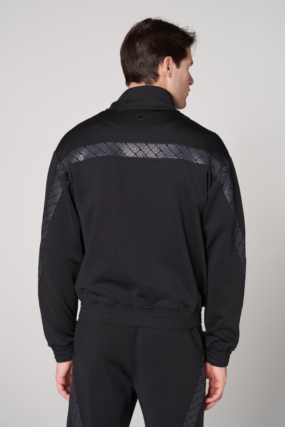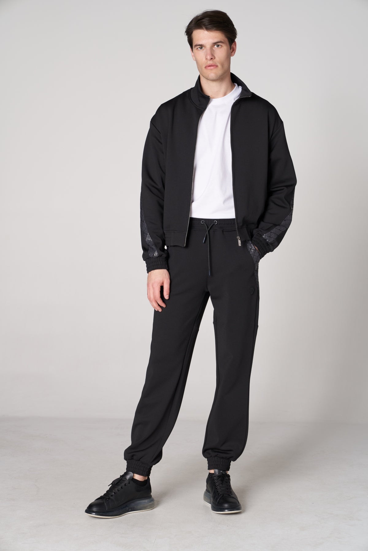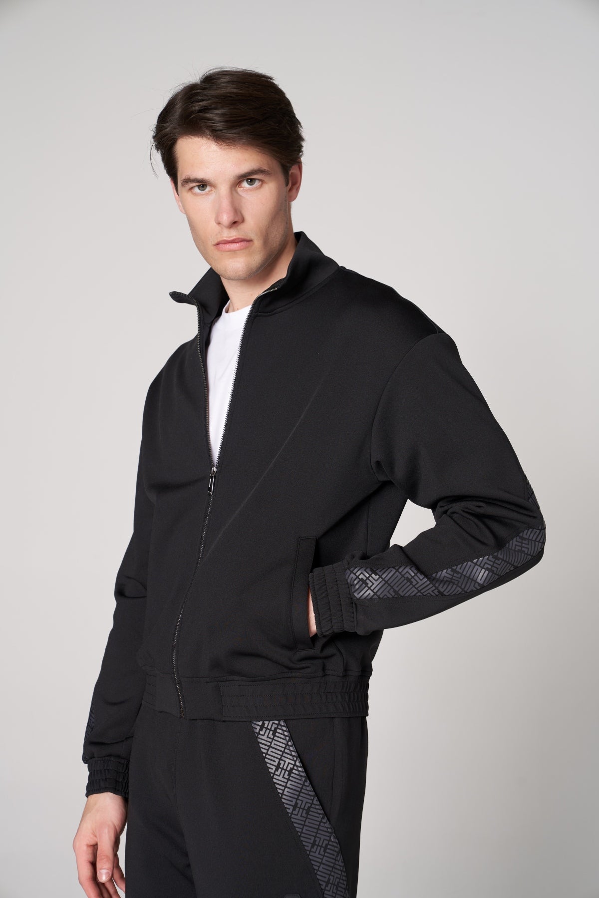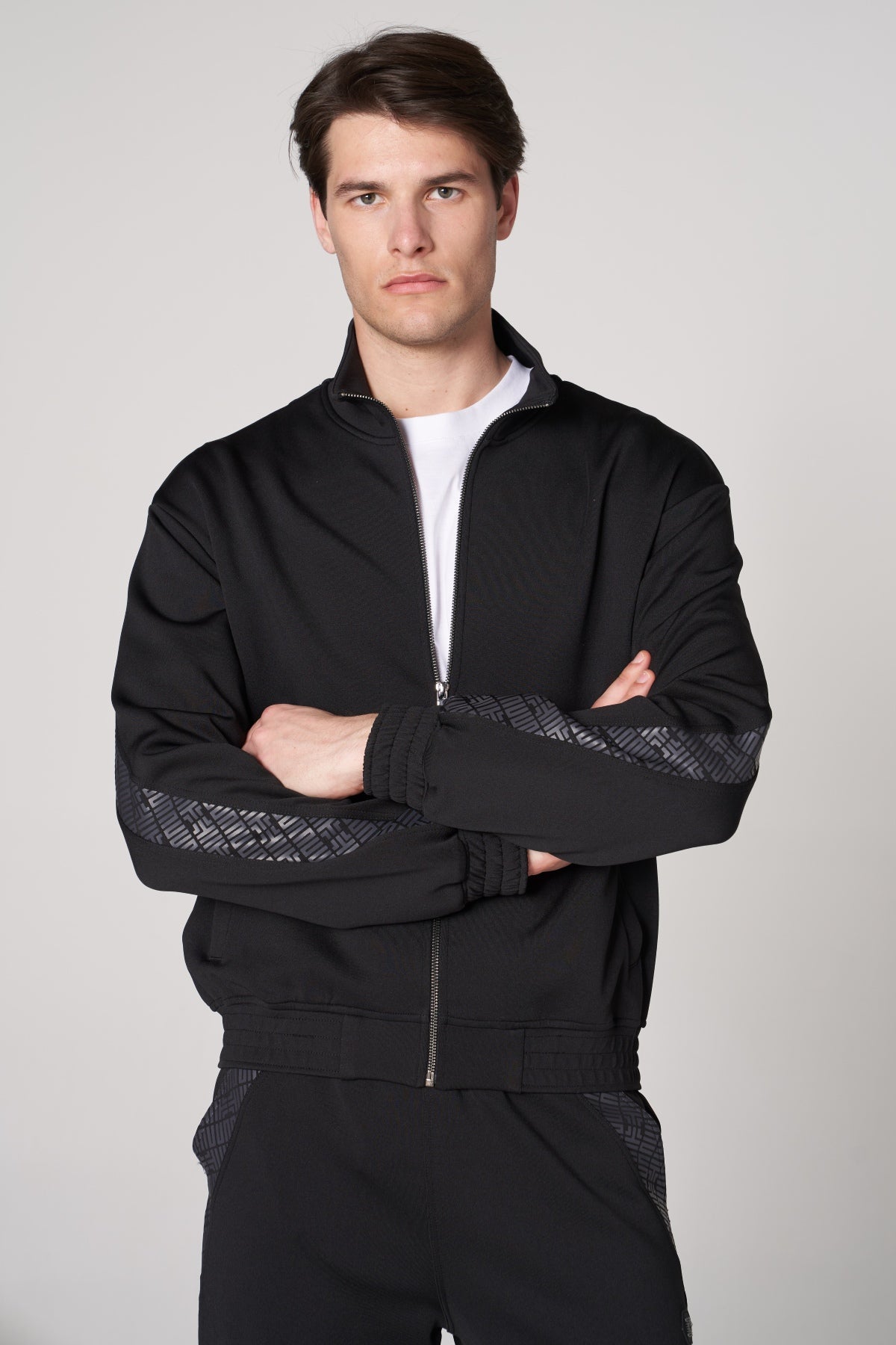 Dik Yaka Fermuarlı Monogram Şerit Detaylı Erkek Eşofman Üstü - Siyah